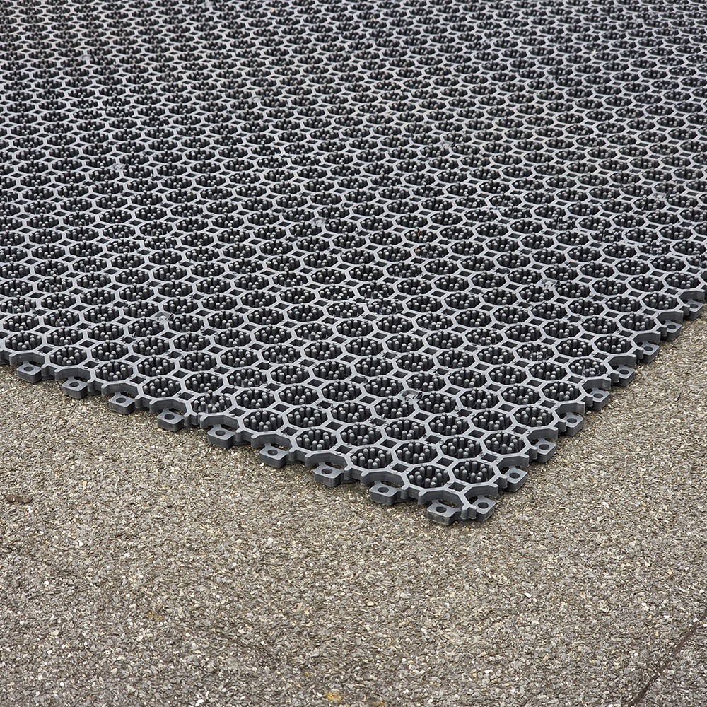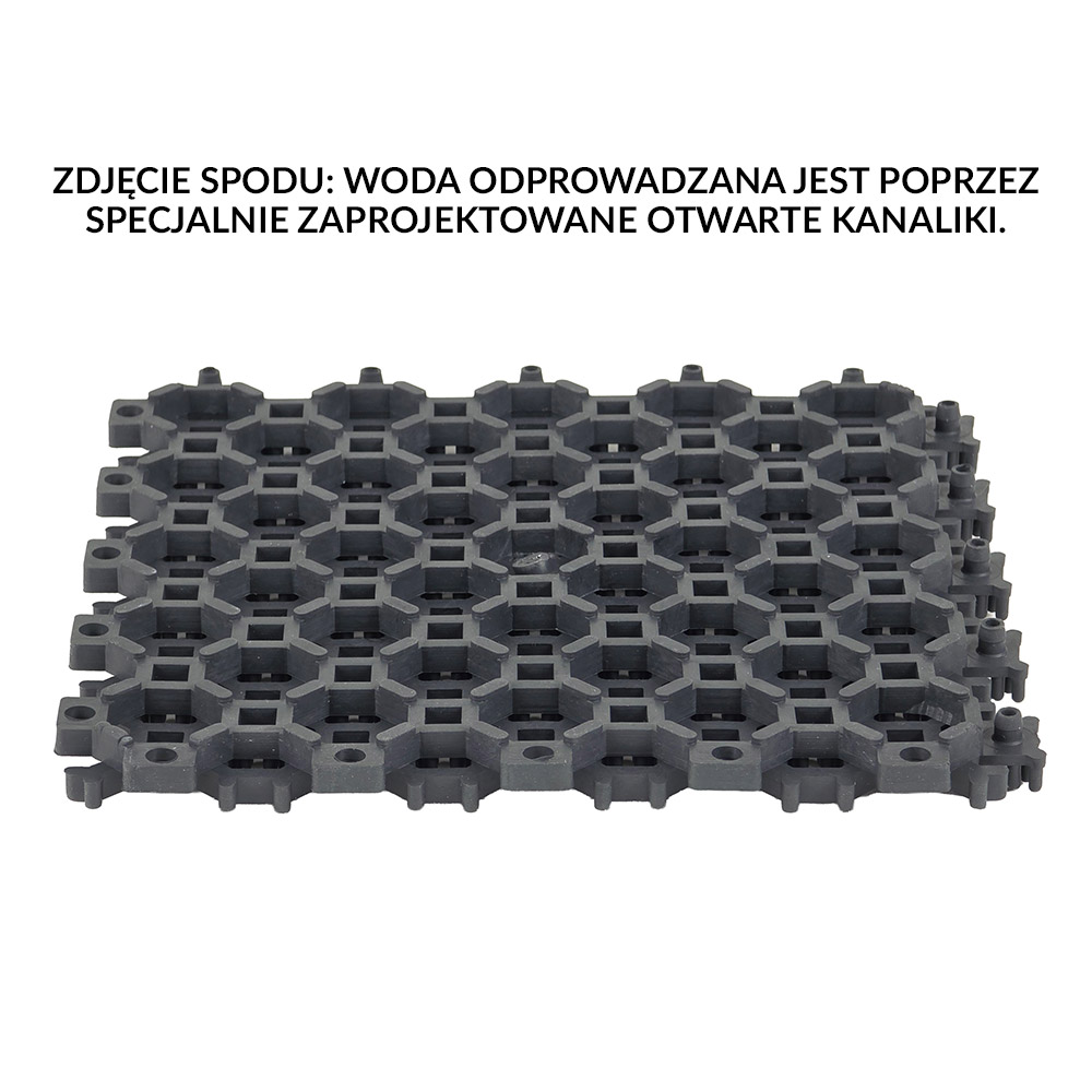 Trwałość – innowacyjny design gwarantuje skuteczne odprowadzanie wody poprzez otwarte kanaliki, co znacznie zwiększa trwałość wykładziny i zabezpiecza powierzchnię, na której jest stosowana. Dzięki temu, możesz cieszyć się swoją przestrzenią na zewnątrz bez obaw o szkody spowodowane przez wilgoć.